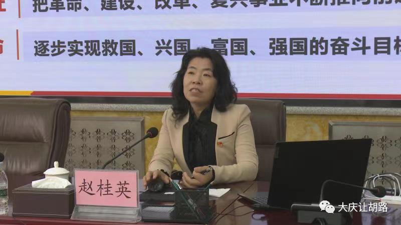 报告会上,赵桂英副教授以《一个世纪初心不改,两个百年复兴梦圆》为题,从深刻学习领会习总书记关于党的历史的重要论述,充分认识开展党史学习教育的重大意义;认真研读党史基本著作,全面了解中国共产党百年奋斗的光辉历程和历史性贡献;深刻把握开展党史学习教育的重点,在“六个进一步”上下功夫;学懂弄通做实习近平新时代中国特色社会主义思想,凝聚起“争当排头兵、建设新大庆”的强大力量等方面进行了深入讲解。赵桂英教授的报告内容丰富、脉络清晰、语言生动,引用大量精彩的图文、影视资料,生动形象地阐明了中国共产党践行初心使命的百年奋斗历程,为全区党员干部全面深刻认识理解百年党史和下一步组织开展好党史学习教育做了一次重要辅导,为进一步坚定中国特色社会主义道路自信、奋力开创全区各项事业发展新局面,提供了有益借鉴。