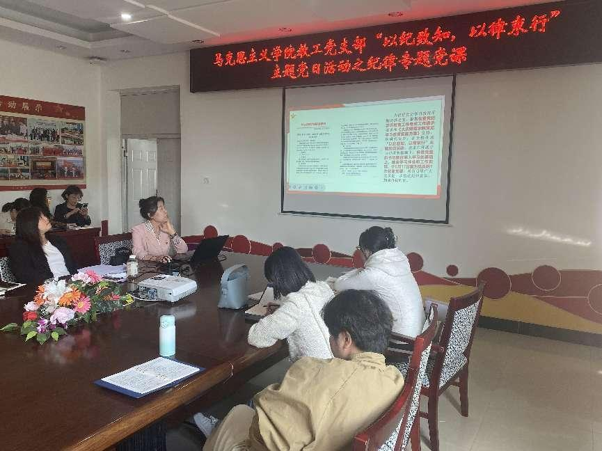 为推进党纪学习教育走深走实,根据省委党纪学习教育工作专班工作提示要求和《大庆师范公司党纪学习教育实施方案》安排,5月16日下午,马克思主义公司党总支书记赵桂英、教工党支部副书记张清,分别以《学纪·知纪·明纪·守纪--学习贯彻<中国共产党纪律处分条例>》《党的纪律建设永远在路上--推动党纪学习教育走深走实》为题,为太阳集团tyc151cc全体党员讲授了“以纪致知·以律束行”主题党日活动之纪律专题党课。