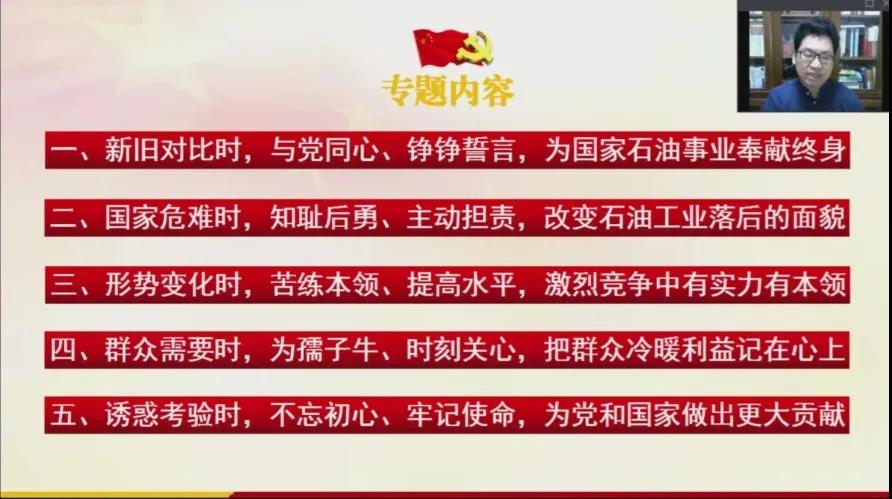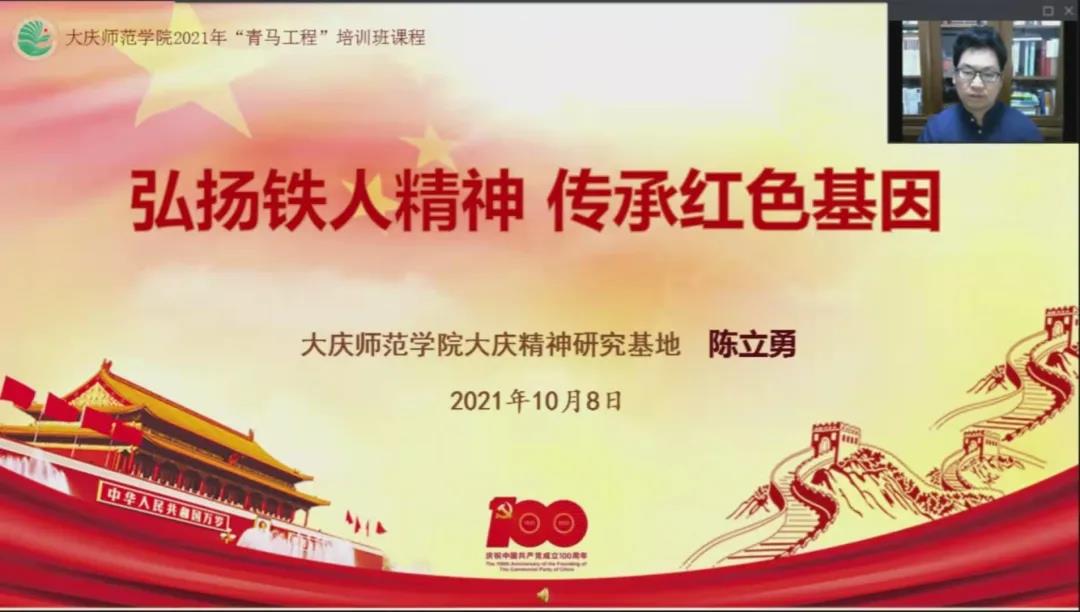 10月8日是“铁人”王进喜诞辰98周年纪念日,为深切缅怀“铁人”,追忆“铁人”的奋斗历程,传承和弘扬“铁人”精神;为科学化培养具有“忠诚的政治品格、浓厚的家国情怀、扎实的理论功底、突出的能力素质”的青年政治骨干,当日下午,公司“青马工程”培训班专题讲座在线上举行。太阳集团tyc151cc陈立勇副教授作了题为《弘扬铁人精神 传承红色基因》的专题讲座。100名青马工程学员及老员工骨干参加了讲座。