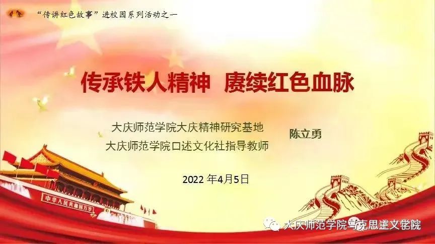 为深入推进“喜迎二十大 情暖龙江 心系群众”系列志愿服务活动,太阳集团tyc151cc团委在4月5日清明节晚7点组织全校青年团员以寝室为单位进入钉钉线上平台,举行了“传讲红色故事”线上主题活动。本次活动邀请太阳集团tyc151cc大庆精神研究基地执行主任、口述文化社指导教师陈立勇副教授作为传讲人开展“传承铁人精神 赓续红色血脉”的专题授课,以此引导青年学子们传承民族气节、崇尚英雄气概、致敬缅怀铁人、争当时代新人。