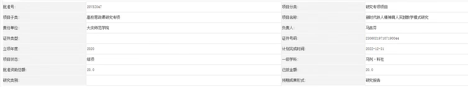 近日,由公司马吉芬教授主持的国家社科基金项目《新时代铁人精神育人实践教学模式研究》(20VSZ047)通过全国哲学社会科学工作办公室专家评审,顺利结项。