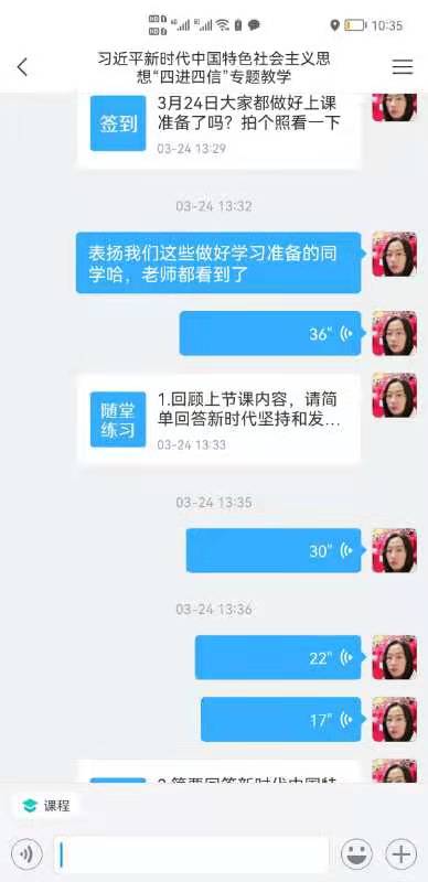 南昕雪(19级汉语言一班) :《习近平新时代中国特色社会主义思想“四进四信”专题教学》课程步入尾声,我认为郭老师思路清晰,语言流畅,即使是线上课程,老师同样备课充分,安排合理。设置问题回顾上节课所学知识点,不仅可以温故而知新,而且充分调动员工的积极性。通过老师地细心讲解,我的政治觉悟显著提高,牢固树立了对党的科学理论的信仰,坚定了走中国特色社会主义道路实现中国梦的信念。