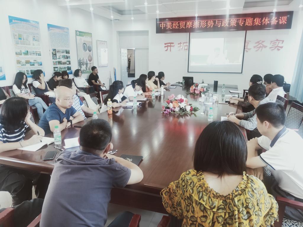 8月30日下午2点半,按照上级有关部门的要求,马院组织公司思政课教师代表观看直播课培训,由商务部研究院对外贸易研究所所长梁明博士做的题为《中美经贸摩擦的形势与政策》的讲座。校宣传部部长郭春满、学工处负责人楚丽丽、各公司员工党支部书记及马院全体思政课教师参加了本次集体备课。