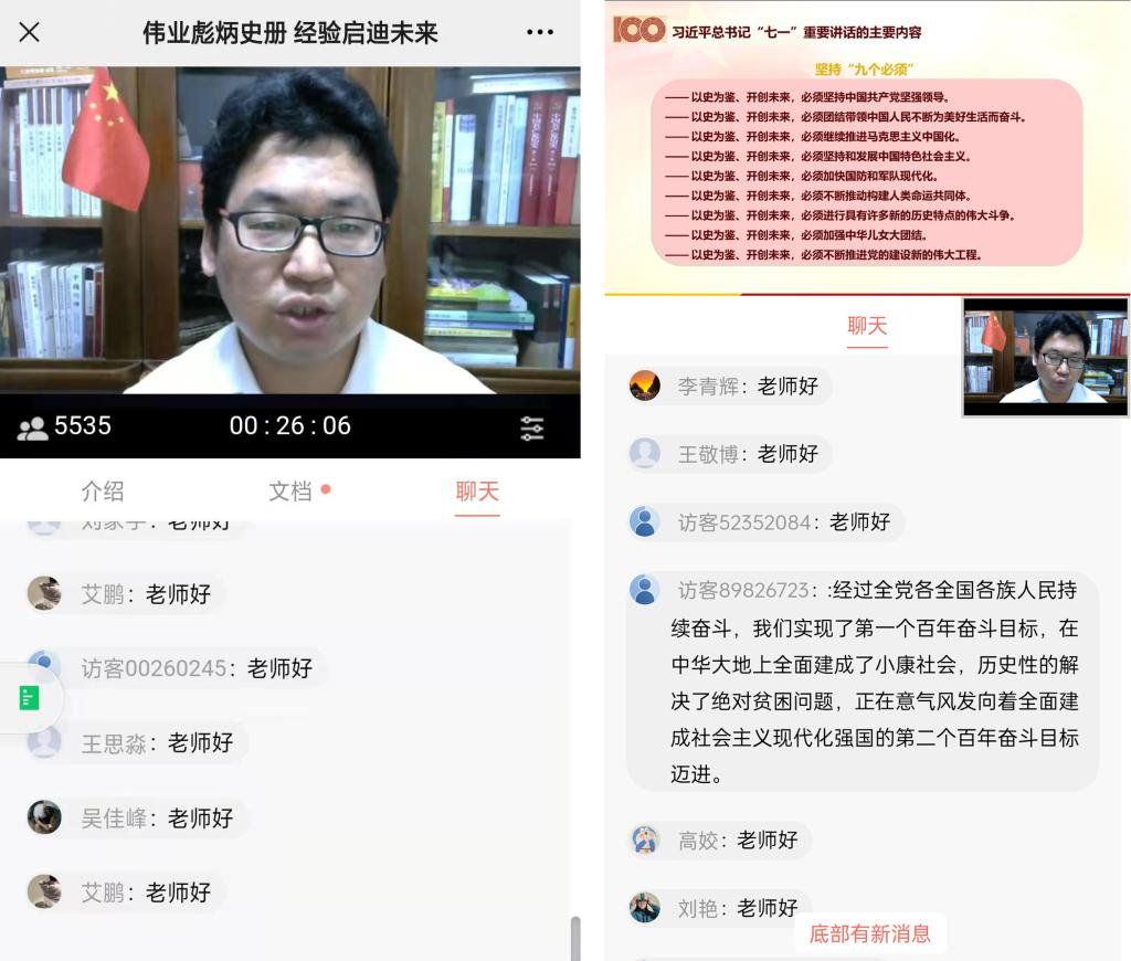 为深入学习贯彻习近平总书记在庆祝中国共产党成立100周年大会上的重要讲话精神,教育引导广大青年员工听党话、感党恩、跟党走,以不负时代、不负韶华的奋进姿态开启2021年秋季学期新征程。公司于2021年8月31日18:30,开展了以学习贯彻“七一”重要讲话精神为内容的2021年秋季学期“开学第一课”活动,特邀“七一”重要讲话精神省委宣讲团成员、公司太阳集团tyc151cc副教授陈立勇,通过超星学习通平台直播的方式给全体在校员工开课。
