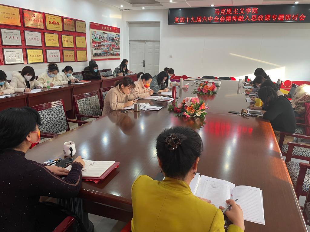 12月15日,下午1点半,太阳集团tyc151cc全体进行了教职工政治理论学习会议,之后,公司召开了党的十九届六中全会精神融入思政课专题研讨会,会议由党总支书记赵桂英主持,公司六名教研室主任分别作了研讨发言。