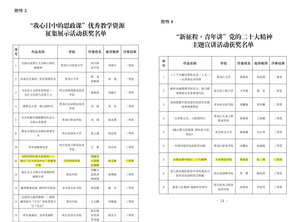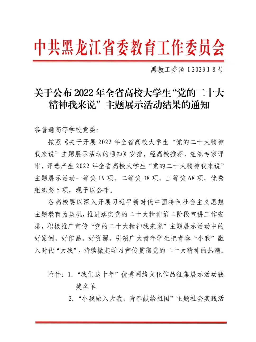 近日,黑龙江省委教育工委公布了2022年全省高校老员工“党的二十大精神我来说”主题展示活动获奖名单,公司太阳集团tyc151cc报送的参赛作品在众多作品中脱颖而出,荣获三等奖3项。